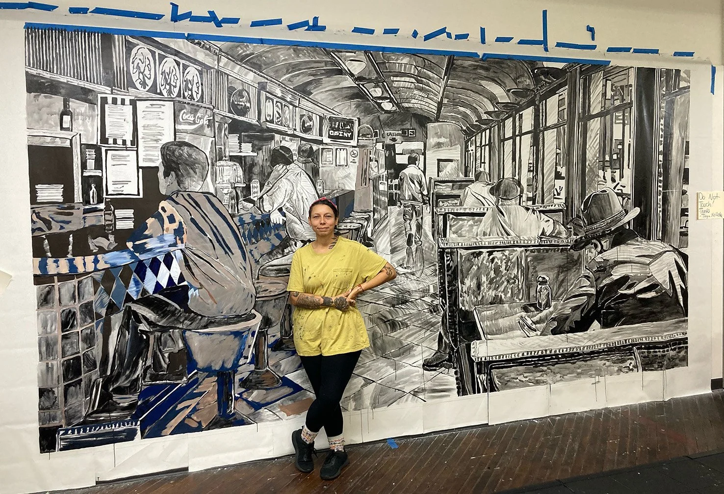 This February, Tanya put the final touches on the painting and later applied a working varnish, then meticulously took each strip down from the wall, rolled it up, and handed it over to the installers.